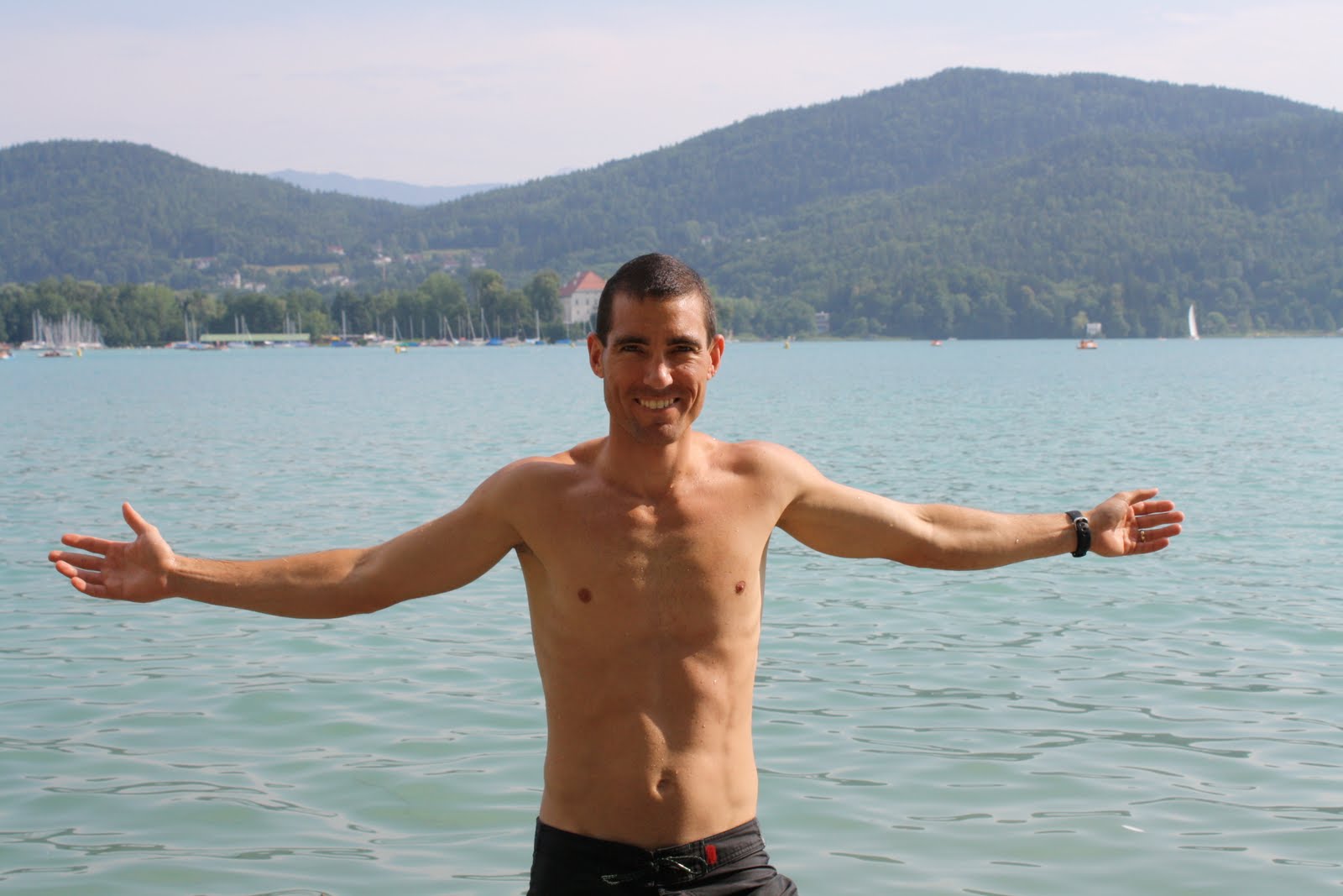 We found a spot on a little uphill where the runners come under a bridge. B/c it's a double loop course, the runners went by that spot 4 times. After seeing Kat and Jeff go by, we checked out the winner's finish and then looked for another good spot. We found a great spot by the lake and saw Jeff go by. We missed Kat again, and Janda was worried again, but it turned out that Kat was running faster than expected and we missed her b/c we were too late. We jumped in the lake for a dip b/c it was intensely hot and then found a spot closer to the finish. We missed Jeff's finish, but saw/heard Kat's finish and found Jeff. The both did awesome and it was so much fun to watch IM Austria. It was super spectator friendly, with double loop courses, the crowds were crazy and there was a party atmosphere the whole day long!